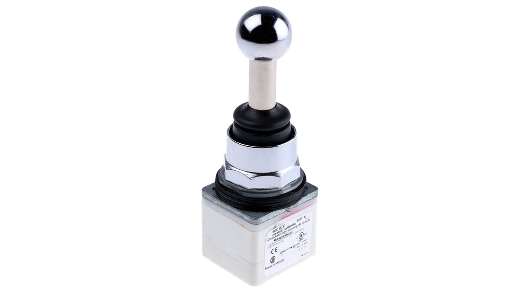Interruttore joystick per controlli industriali, Schneider Electric, serie Harmony 9001K, 3 assi, protezione IP66, materiale contatti in lega d'argento, fusibile a cartuccia 10 A, temperatura operativa -25 a 70 gradi Celsius, resistenza alle vibrazioni fino a 7 gn, urti fino a 50 gn, profondità retro pannello 30 mm, compatibile con pannelli di controllo, settori marittimi e macchine per impieghi gravosi.