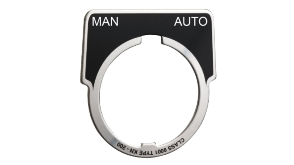 Piastra per legenda Schneider Electric per uso con Serie Harmony 9, codice costruttore 9001KN243, disponibile in plastica o alluminio, accessorio per etichettatura, compatibile con testo etichetta Man - Auto, progettata per la Serie Harmony 9001K.