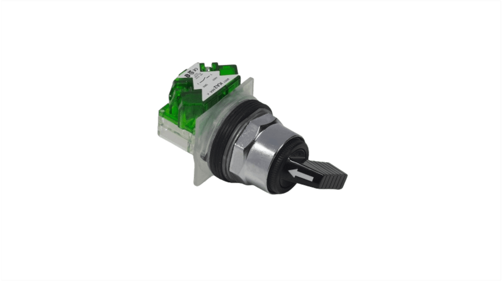Selettore a 2 posizioni, diametro foro 30 mm, cornice in metallo, 1 contatto normalmente aperto, maniglia lunga, collegamenti tramite terminali a morsetto a vite, colore cappuccio nero, modalità di permanenza, senza mercurio, conforme a RoHS, prodotto verde Premium.