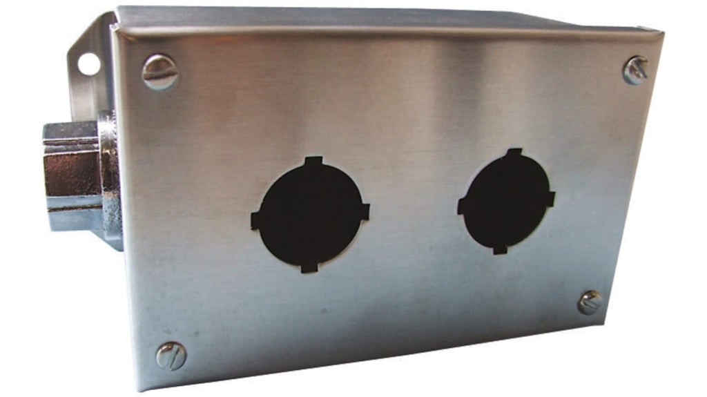 Contenitore per pulsanti in acciaio inox, progettato per unità di comando e controllo della gamma Harmony Style 9, diametro foro 30mm, 2 fori, temperatura operativa da -40 a +70 gradi Celsius, compatibile con serie 9001K e 9001SK, senza marcatura. Codice costruttore 9001KYSS2, marchio Schneider Electric.