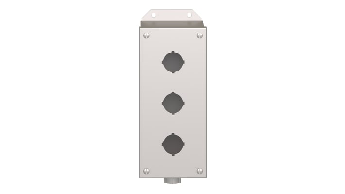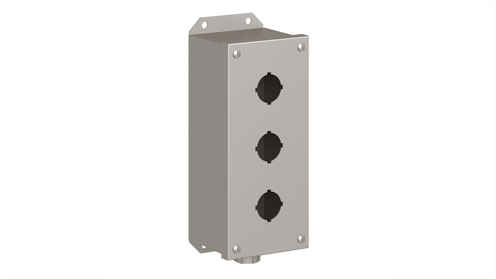 Contenitore vuoto in acciaio inox per stazione di controllo Schneider Electric, codice 9001KYSS3. Dotato di 3 aperture per unità di controllo e segnalazione con diametro di 30 mm. Realizzato in acciaio inox di alta qualità, conforme alle normative RoHS e Reach. Serie Harmony 9001SK. Adatto a varie applicazioni, garantisce protezione affidabile per le apparecchiature.