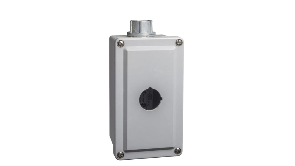 Stazione di controllo vuota per unità di controllo e segnalazione, diametro foro 30 mm, numero di fori 1, colore contenitore grigio, materiale contenitore alluminio, senza mercurio, conforme RoHS, serie 9001T. Prodotto sostenibile verde premium.