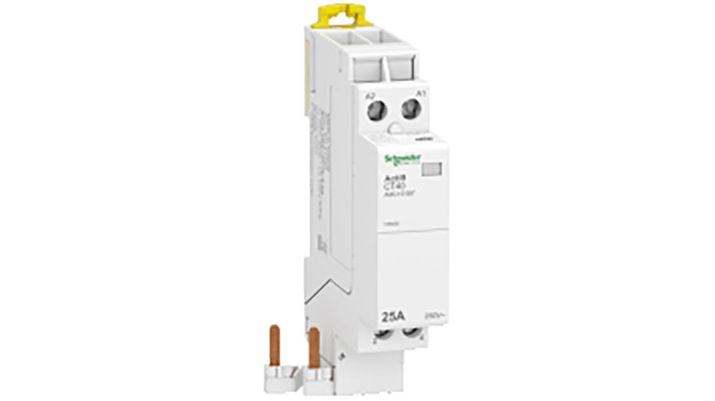 Contattore Schneider Electric, serie Acti9 iDT40 CT, 2 poli, 2 NA, 25 A, bobina 230 V c.a. Tensione nominale contatto 250 V c.a., corrente nominale contatto 25 A, montaggio su guida DIN, dimensioni 18 mm x 66 mm x 87 mm, temperatura operativa da -5°C a +60°C, grado di protezione IP20, contatti ausiliari incorporati, collegamenti a vite, funzione relè a impulsi, funzione giorno/notte. Codice costruttore A9C15187.