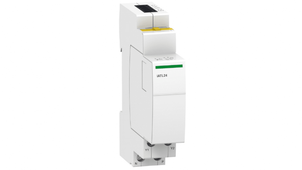 Blocco di contatti ausiliari per guida DIN. 1 contatto di commutazione, configurazione stato normale 1 N/A, tensione di controllo 24VAC a 240VAC, corrente nominale contatto 100 mA, tensione nominale contatto 24 V. Grado di protezione IP20 e IP40 in contenitore. Montaggio a destra del relè a impulsi ITL. Conforme a EN/IEC 60669-2-2. Marchio Schneider Electric, serie A9C1, codice costruttore A9C15424.
