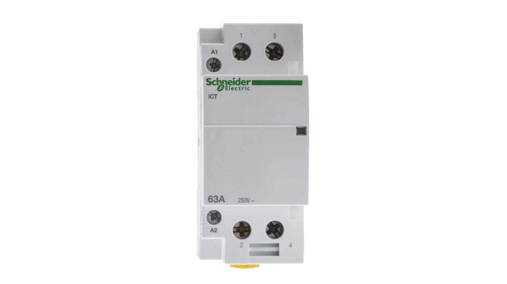 Contattore Schneider Electric, serie iCT, 2 poli, 2 N/A, 63 A, bobina 24 V c.a. Tensione nominale contatto 250 V c.a., corrente nominale contatto 63 A, tipo terminale a vite, montaggio a pannello o su guida DIN, dimensioni 85 mm x 36 mm x 68 mm, temperatura operativa da -5°C a +60°C, grado di protezione IP20. Contatti ausiliari incorporati, funzione relè a impulsi e giorno/notte. Codice costruttore A9C20162.