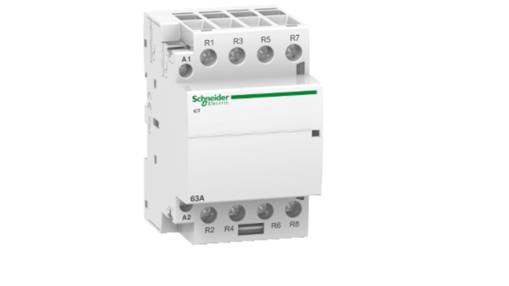 Contattore modulare Schneider Electric Acti9 ICT, 4 poli, 4 contatti normalmente chiusi, corrente nominale 63 A per AC-7a, 20 A per AC-7b, tensione di esercizio 400 VAC, tensione di controllo 24 VAC, grado di inquinamento 2, montaggio su guida DIN, larghezza 6 passi di 9 mm, compatibile con dispositivi ausiliari Acti9 per applicazioni di illuminazione, riscaldamento e ventilazione. Codice costruttore A9C20167.