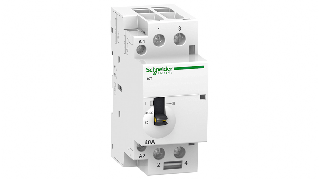 Contattore Schneider Electric, serie iCT, 2 poli, 2 N/A, 40 A, bobina 24 V c.a. Tensione nominale contatto 250 V c.a., corrente nominale contatto 40 A, tipo terminale a vite, montaggio a pannello o su guida DIN, dimensioni 36 mm x 85 mm x 73 mm, temperatura operativa da -5°C a +60°C, grado di protezione IP20.