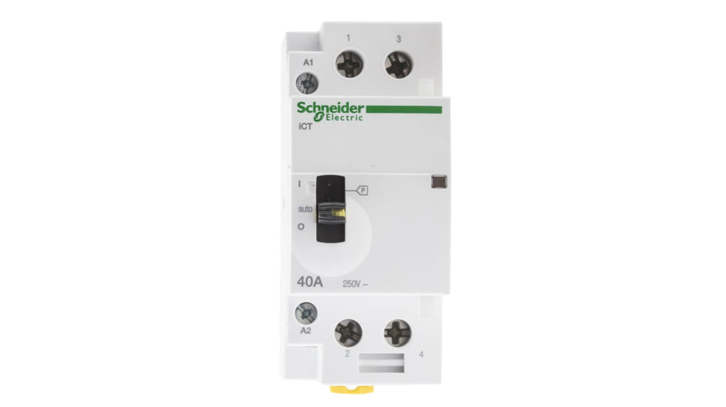 Contattore Schneider Electric, serie iCT, 2 poli, 2 N/A, 40 A, bobina 230 V ca. Tensione bobina 230 V ca, corrente nominale contatto 40 A, tensione nominale contatto 250 V c.a., tipo terminale vite, dimensioni 36 mm x 85 mm x 73 mm, temperatura operativa da -5°C a +60°C, montaggio a pannello o su guida DIN, contatti ausiliari incorporati, grado di protezione IP20. Codice costruttore A9C21842.