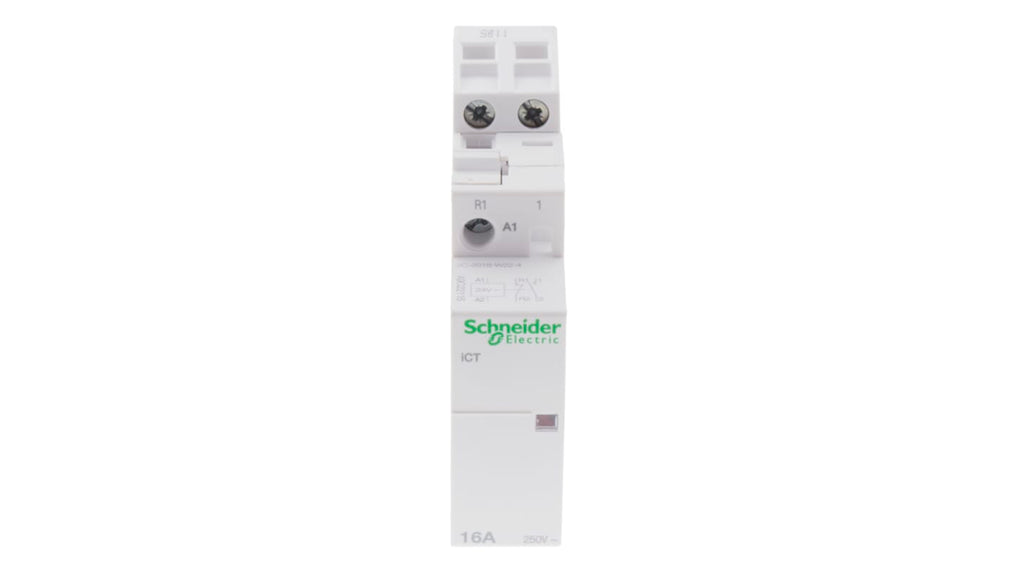 Contattore Schneider Electric, serie iCT, 2 poli, 1 NO + 1 NC, 16 A, bobina 24 V c.a., tensione nominale contatto 250 V c.a., montaggio a pannello o su guida DIN, terminali a vite, dimensioni 81 mm x 18 mm x 68 mm, temperatura operativa da -5°C a +60°C, grado di protezione IP20, configurazione DP, contatti ausiliari incorporati, funzione relè a impulsi e giorno/notte. Codice costruttore A9C22115.