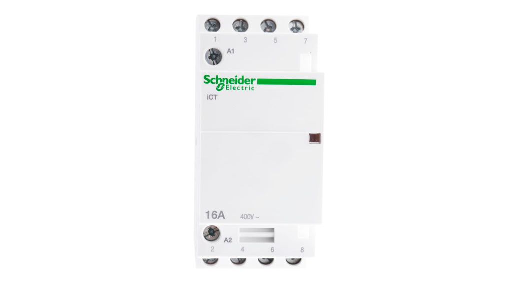 Contattore Schneider Electric, serie iCT, 4 poli, 4NO, 16 A, bobina 230 V ca. Tensione nominale contatto 400 V c.a., corrente nominale contatto 16 A, tipo terminale vite, montaggio a pannello o su guida DIN, dimensioni 36 mm x 81 mm x 68 mm, temperatura operativa da -5°C a +60°C, grado di protezione IP20. Configurazione stato normale 4NO, distanziali raccomandati per montaggio su guida DIN. Codice costruttore A9C22814.