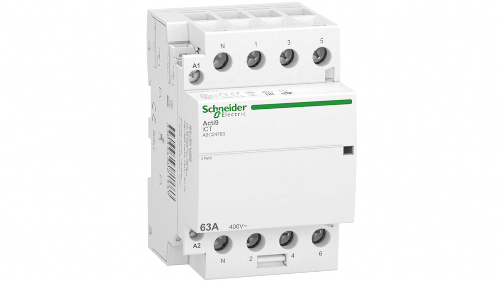 Contattore Schneider Electric, 4 poli, 4NO, corrente nominale 63 A, tensione bobina 240 V c.a., grado di protezione IP20, temperatura operativa da -5 a 60 gradi Celsius, frequenza di rete 50 Hz, serie Acti 9. Dimensioni compatte, adatto per diverse applicazioni industriali. Codice costruttore A9C24763.