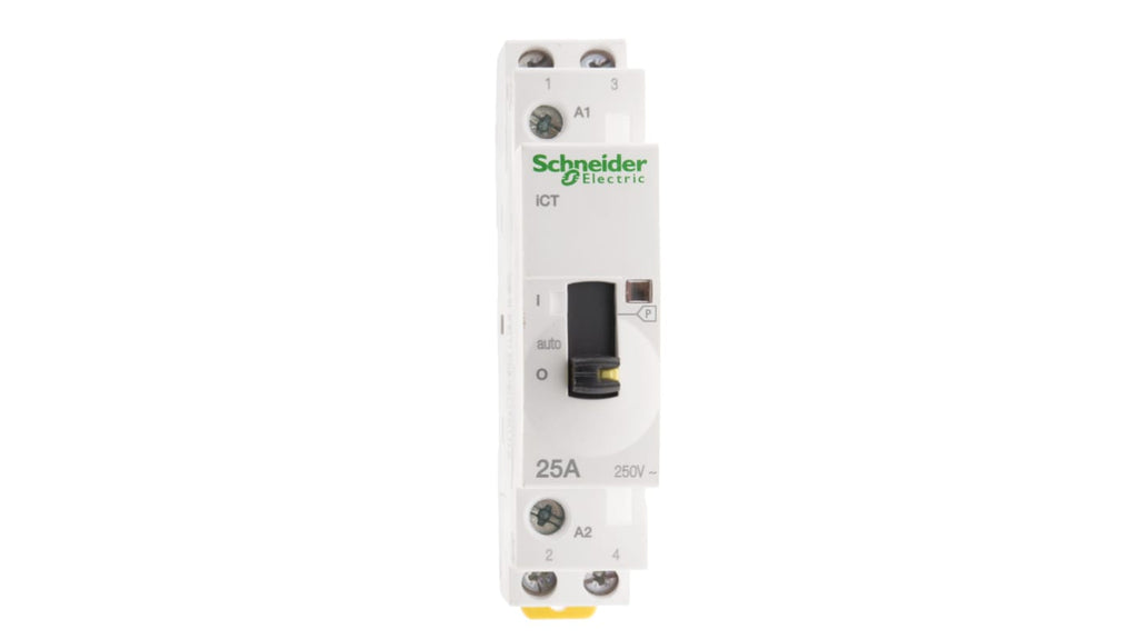 Contattore Schneider Electric, serie iCT, 2 poli, 2 NO, 25 A, bobina 230 V ca. Tensione nominale contatto 250 V c.a., corrente nominale contatto 25 A, tipo terminale a vite, montaggio a pannello o su guida DIN, dimensioni 81 mm x 18 mm x 60 mm, temperatura operativa da -5°C a +60°C, grado di protezione IP20. Configurazione con contatti ausiliari incorporati. Codice costruttore A9C25732.