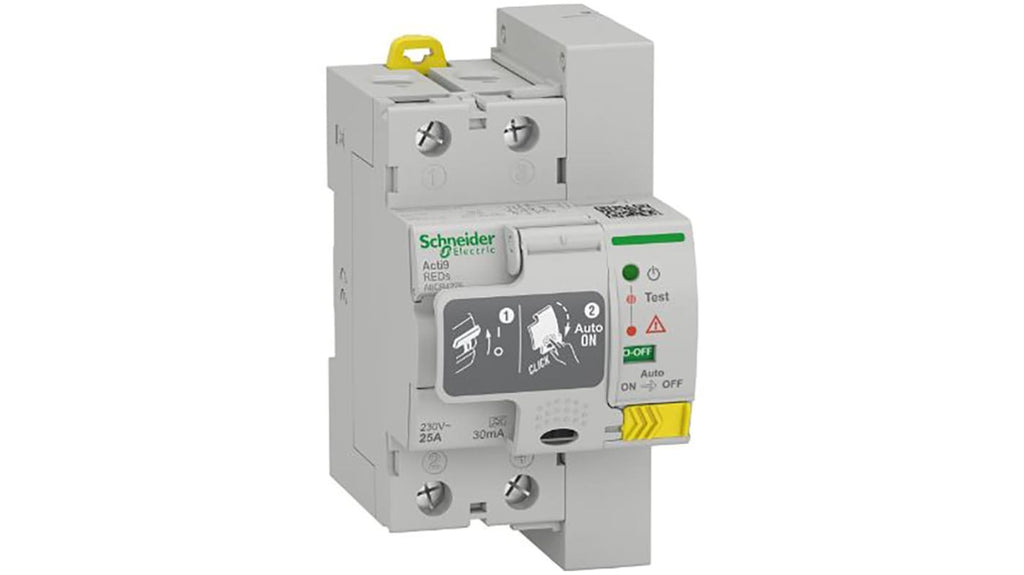 Interruttore differenziale RCCB per guida DIN, 2 poli, 25A, sensibilità 30mA, Tipo A, tensione nominale 230V ca, montaggio guida DIN, grado di protezione IP20, temperatura ambiente d'esercizio da -5 a 40 gradi Celsius, peso netto 278g, serie Acti 9, gamma REDs.