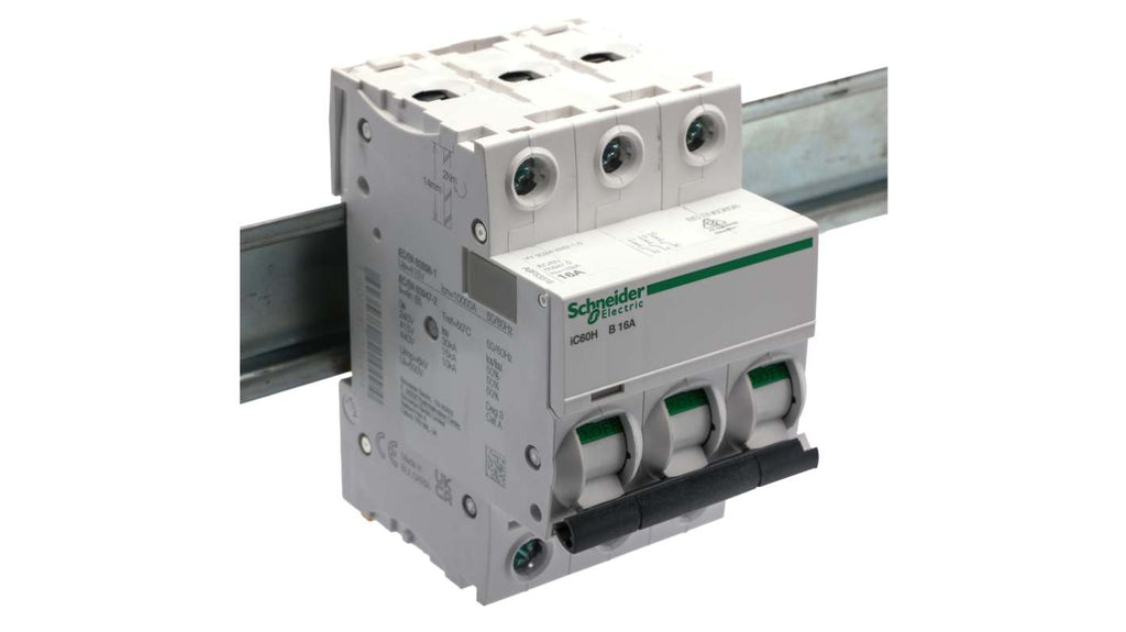 Interruttore magnetotermico Schneider Electric 3P 16A 10 kA, Tipo B. Gamma Acti 9, serie iC60H. Numero di poli: 3P, amperaggio: 16A, caratteristica di intervento: Tipo B, tensione nominale c.a.: 440 V, 12-133 V, 220-240 V, 380-415 V, tensione nominale c.c.: 100-133 V, capacità di rottura: 10 kA. Montaggio su guida DIN, dimensioni: 85mm x 54mm x 78.5mm, meccanismo di scatto magnetotermico, attuatore di reset a bilanciere, contatti terminali a vite. Conforme a IEC/EN 60898 e IEC/EN 60947-2.