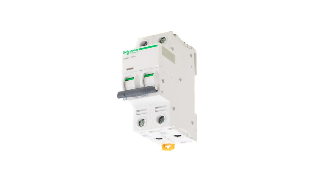 Interruttore magnetotermico Schneider Electric 2P 4A 6 kA, Tipo C. MCB Acti 9 serie iC60N, conforme alle norme IEC 60898 e IEC 60947-2. Montaggio su guida DIN, meccanismo di attivazione termomagnetico, protezione terminale IP20. Dimensioni 36mm x 85mm x 78.5mm, capacità di rottura 6 kA, tensione nominale 400V AC, 125V DC. Applicazioni in distribuzione e automazione industriale. Codice costruttore A9F74204.