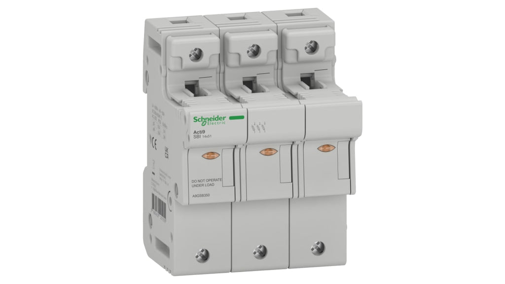 Sezionatore portafusibili Schneider Electric, numero di poli 3, corrente massima 50A, fusibile integrato, dimensioni fusibile 14 x 51mm, montaggio su guida DIN, tensione nominale 690V ca, corrente nominale fusibile 10 A a 50 A, grado di inquinamento 3, temperatura operativa da -20°C a +60°C, notifica visiva per soffiaggio cartuccia. Codice costruttore A9GSB350.