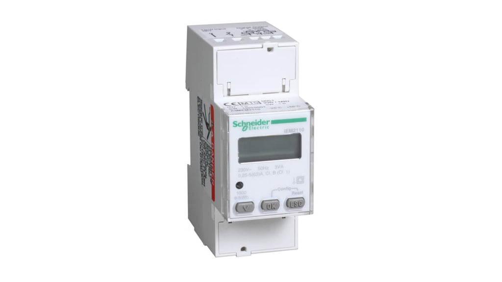 Contatore di energia monofase Schneider Electric, Acti 9 iEM2000, display LCD a 8 cifre, misurazione diretta fino a 63 A, profondità 64 mm, temperatura operativa da -25 a +70 gradi Celsius, elettronico, conforme a CE, EN 50470-3, IEC 60529, IEC 62052-11, IEC 62053-21, MID. Uscita impulsi disponibile, compatto per montaggio su guida DIN.