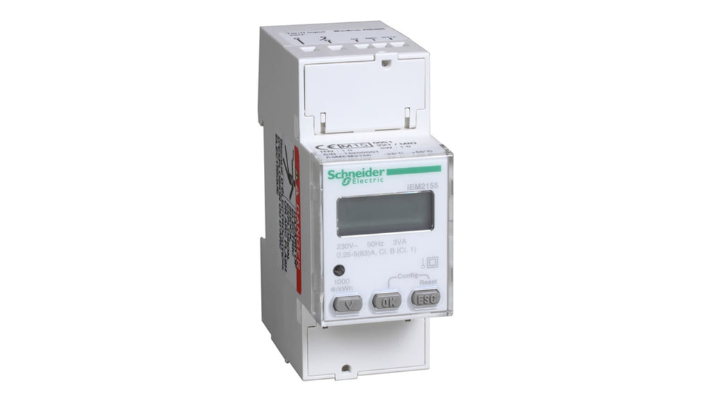 Contatore di energia monofase Schneider Electric, Acti 9 iEM2000, per montaggio su guida DIN, display LCD a 8 cifre, misurazione elettronica, corrente massima 63 A, intervallo di misurazione 0 a 999999.99 kWh, temperatura operativa da -25 a +70 gradi Celsius, conforme a CE e normative IEC, design compatto 1 o 2 moduli, autoalimentato, funzioni di sicurezza anti-manomissione. Codice costruttore A9MEM2155.