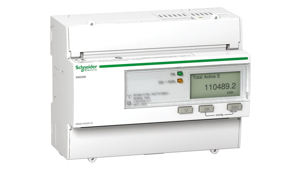 Contatore di energia Schneider Electric, IEM3300, per montaggio su guida DIN, tensione di alimentazione 100-480 V, misurazione di energia attiva, display LCD, 1-3 fasi, temperatura operativa da -25 a 60 C, grado di protezione IP40 e IP20, adatto per misurazione affittuari e sub-fatturazione. Codice costruttore A9MEM3300.