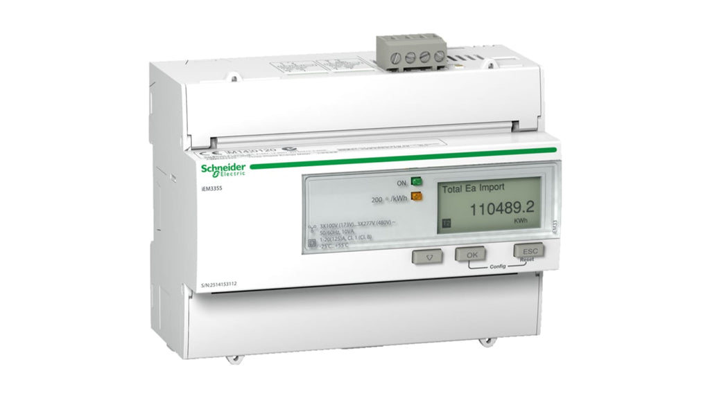 Contatore di energia Schneider Electric, Acti 9 iEM3000, 3 fasi, display LCD a 9 cifre, classe di precisione 1.0 e 0.5S, misurazione elettronica, intervallo 0 a 99999999.9 kWh, profondità 69.3 mm, temperatura operativa da -25 a +55 gradi Celsius, conforme a EN 50470-3 e altre normative, montaggio su guida DIN, orologio interno per registrazione dati, uscita impulsi disponibile.
