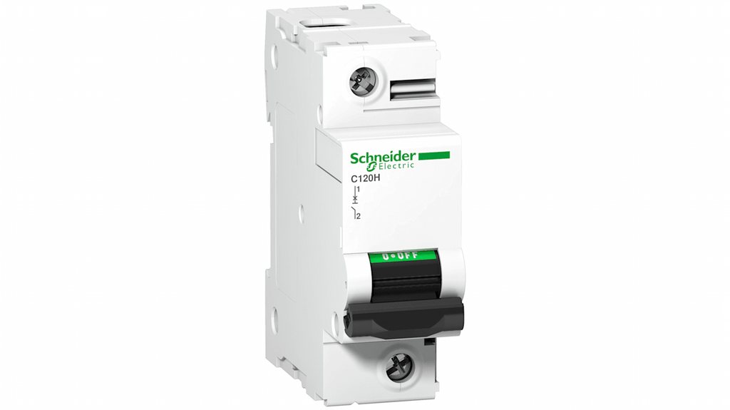 Interruttore automatico miniaturizzato a bassa tensione, 1P, 100A, curva di attivazione C, conforme a EN/IEC 60898-1 e EN/IEC 60947-2, protezione contro cortocircuiti e sovraccarichi, controllo e isolamento, montaggio su guida DIN, grado di protezione IP20, privo di mercurio, modello Acti9 C120H, codice costruttore A9N18447.