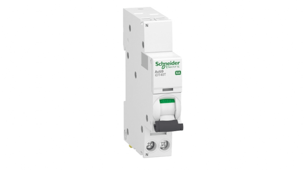 Interruttore magnetotermico 1P+N, 40A, Tipo C, Schneider Electric. Capacità di interruzione 4,5 kA, tensione nominale 230V, umidità relativa 95% a 55 °C. Montaggio a clip su guida DIN, durata elettrica 20000 cicli, temperatura operativa -25 a 70 °C. Bloccabile con lucchetto, conforme a IEC/EN 60898-1 e 60947-2, classificato Schneider Green Premium. Codice costruttore A9PA2640.