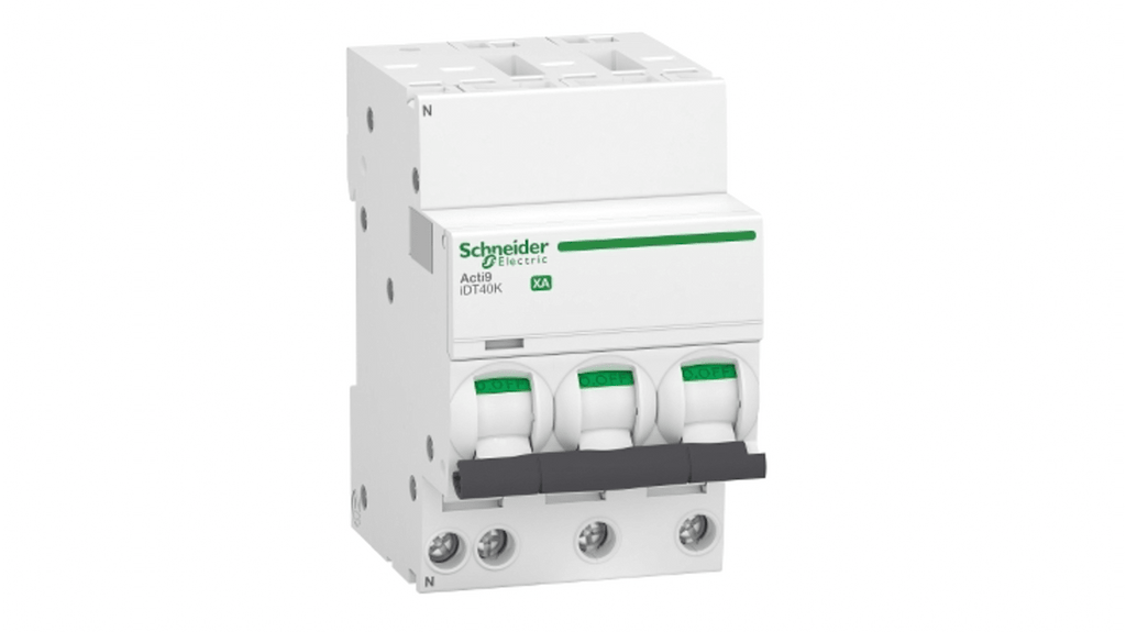 Interruttore magnetotermico Schneider Electric 3P+N 40A, Tipo C, tecnologia magnetotermica, capacità di interruzione 4,5 kA, umidità relativa 95% a 55 °C, tensione nominale 230V, durata elettrica 20000 cicli, temperatura operativa -25 a 70 °C, bloccabile con lucchetto, montaggio a clip su guida DIN, conforme a IEC/EN 60898-1 e 60947-2, classificato Schneider Green Premium. Codice costruttore A9PK1740.