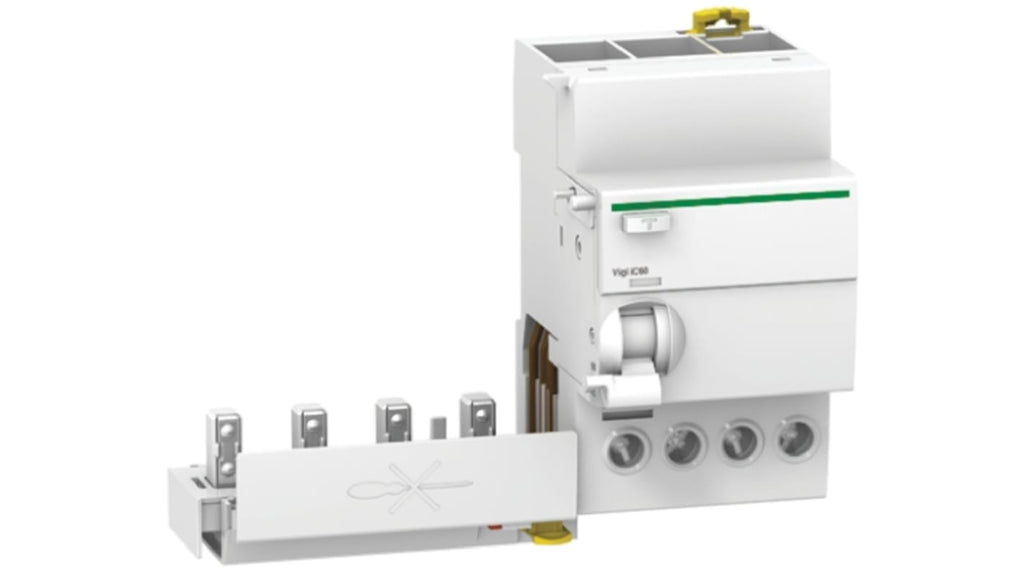 Interruttore differenziale RCD Schneider Electric iC60, 4 poli, 25A, sensibilità 300mA, tipo AC, montaggio su guida DIN, tensione nominale 415V, tempo d'interruzione istantaneo, conforme a IEC/EN 61009, grado di protezione IP20 e IP40, compatibile con barre di distribuzione a pettine a 3 fasi più neutro, 100% di coordinazione tra MCB e RCD.