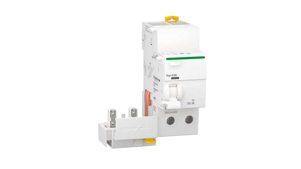 RCCB Schneider Electric, dispositivo a corrente residua modulare, 2 poli, 40A, sensibilità 30mA, Tipo A-SI, tensione nominale 240V ca, serie A9Q, prodotto Green Premium, senza mercurio, protegge contro cortocircuiti, sovraccarichi, scosse elettriche e incendi.