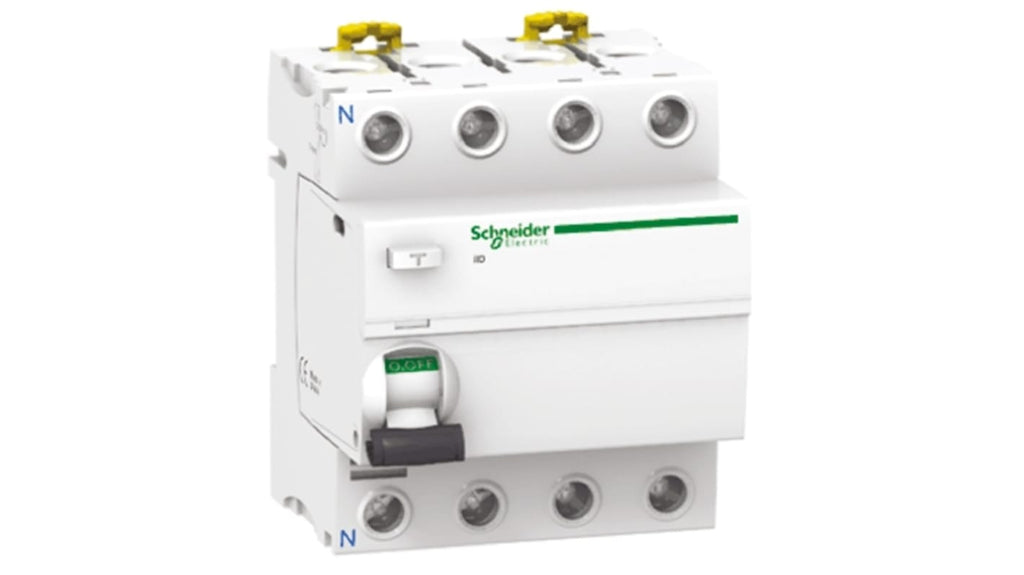 Interruttore automatico a corrente residua RCCB Acti9 iID, 4 poli, 80A, sensibilità 300mA, tensione nominale 400V-415V, montaggio su guida DIN, tempo d'interruzione istantaneo. Protezione da scosse elettriche e rischio di incendio, compatibile con MCB iC60, aumento dell'immunità da interferenze elettriche. Codice costruttore A9R14480, marchio Schneider Electric.