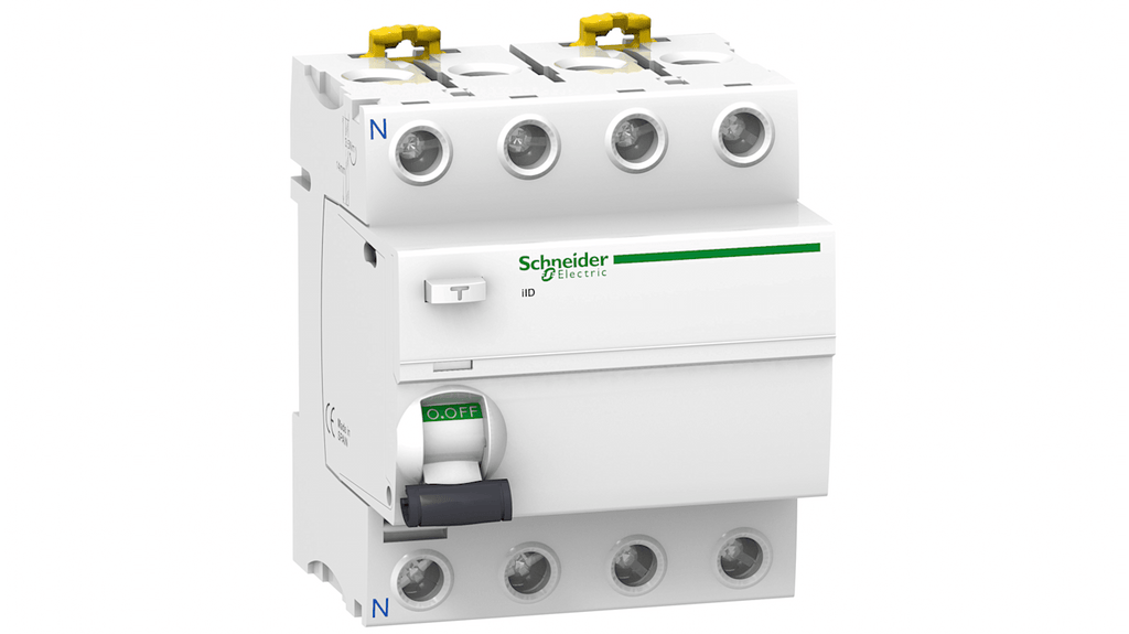 Interruttore differenziale RCCB Schneider Electric, 4 poli, corrente nominale 63 A, sensibilità di intervento 300 mA, tipo AC, tensione nominale 415 V ca, serie Acti 9, grado di protezione IP20 e IP40, temperatura operativa da -25 a 60 gradi, frequenza di rete 50/60 Hz, azionamento manuale tramite interruttore a levetta. Codice costruttore A9R15463.