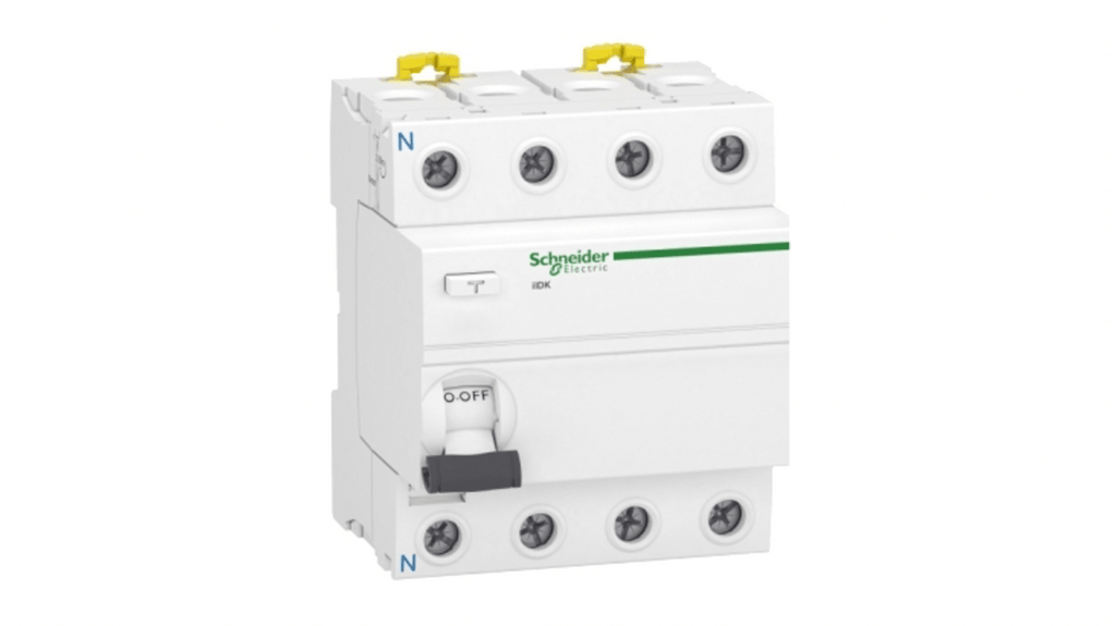 Interruttore automatico di corrente residua RCCB, 4 poli, 40A, sensibilità 30mA, tipo AC, tensione nominale 380-415V ca, montaggio guida DIN, umidità relativa 95% a 55 °C, temperatura operativa -25 a 70 °C, durata elettrica 20000 cicli, tensione di resistenza agli impulsi 4 kV, bloccabile con lucchetto, conforme a EN/IEC 61008-1, classificato Schneider Green Premium.