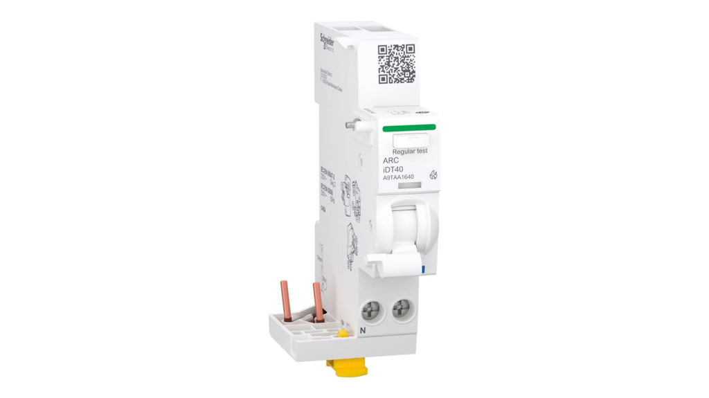 Blocco aggiuntivo di rilevamento guasti ad arco Acti9 Schneider Electric, 1P + N, 40A, funzione di registrazione dati elettrici, ON/OFF, innesco guasto, indicatore diagnostico guasti da arco a LED, umidità relativa 95% a 55 °C, tensione di resistenza agli impulsi 4 kV, modalità di montaggio a clip, durata elettrica 10000 cicli, temperatura operativa -25 a 60 °C, conforme a EN/IEC 62606.