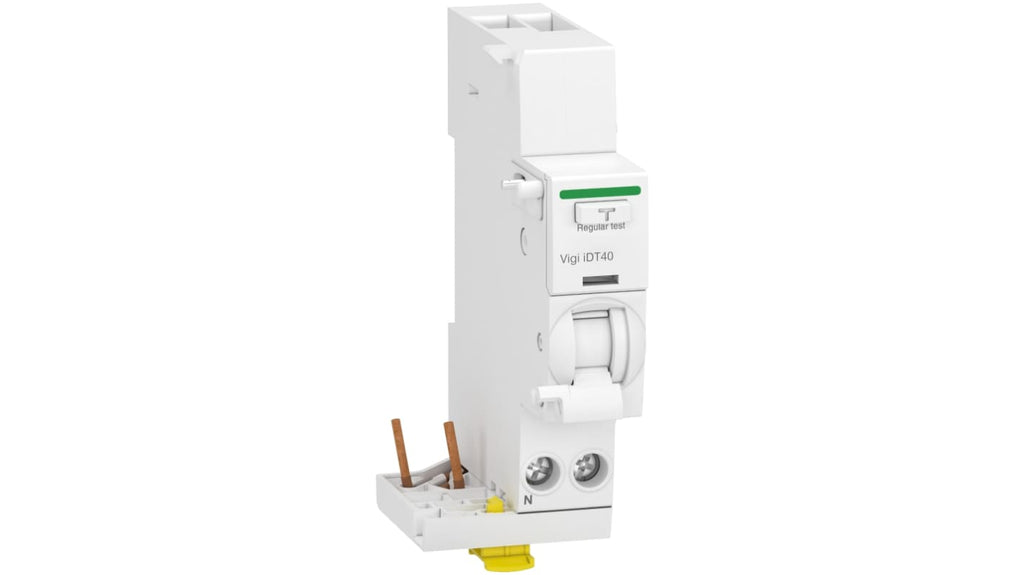 RCD Schneider Electric Vigi iDT40, 1P+N, 25A, sensibilità 30mA. Interruttore automatico RCD, tipo AC, montaggio guida DIN, tensione nominale 230V, meccanismo di scatto magnetotermico, interruttore bistabile. Dimensioni 36 x 74 x 91mm, lunghezza complessiva 36mm, profondità 91mm. Tempo d'interruzione istantaneo, tipo di contatto terminale a vite. Gamma Acti9, serie Vigi iDT40. Codice costruttore A9Y62625.