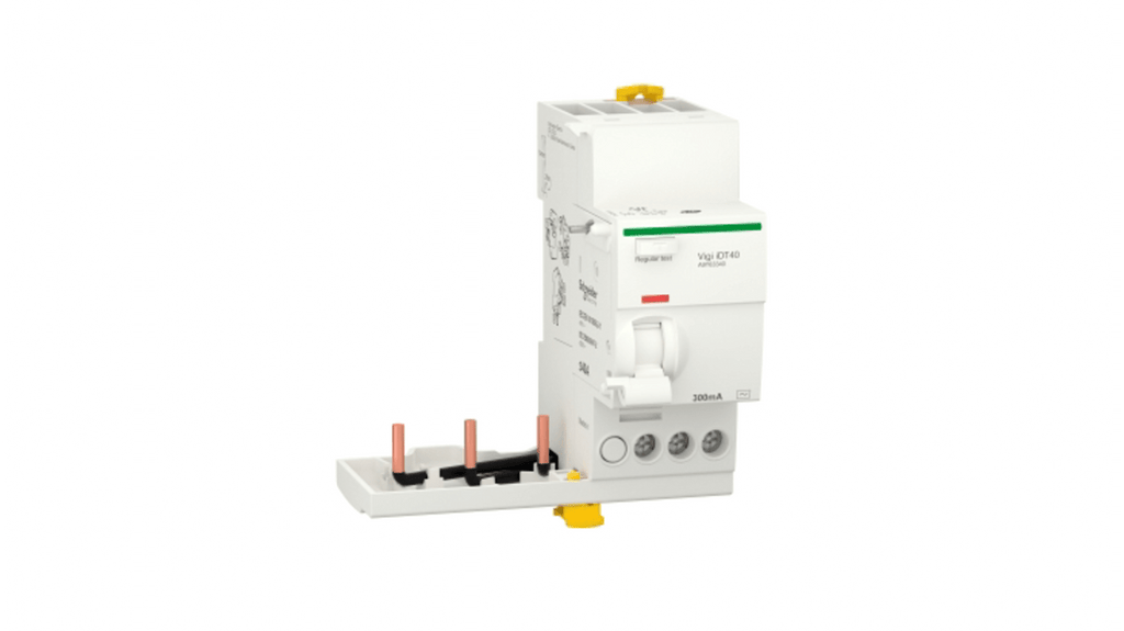 Interruttore automatico di corrente residua RCCB, 3 poli, 40A, sensibilità 300mA, tipo AC, tensione nominale 400V ca, montaggio guida DIN, umidità relativa 95% a 55 °C, temperatura operativa -25 a 70 °C, durata elettrica 20000 cicli, tensione di resistenza agli impulsi 4 kV, bloccabile con lucchetto, conforme a EN/IEC 61008-1, classificato Schneider Green Premium.
