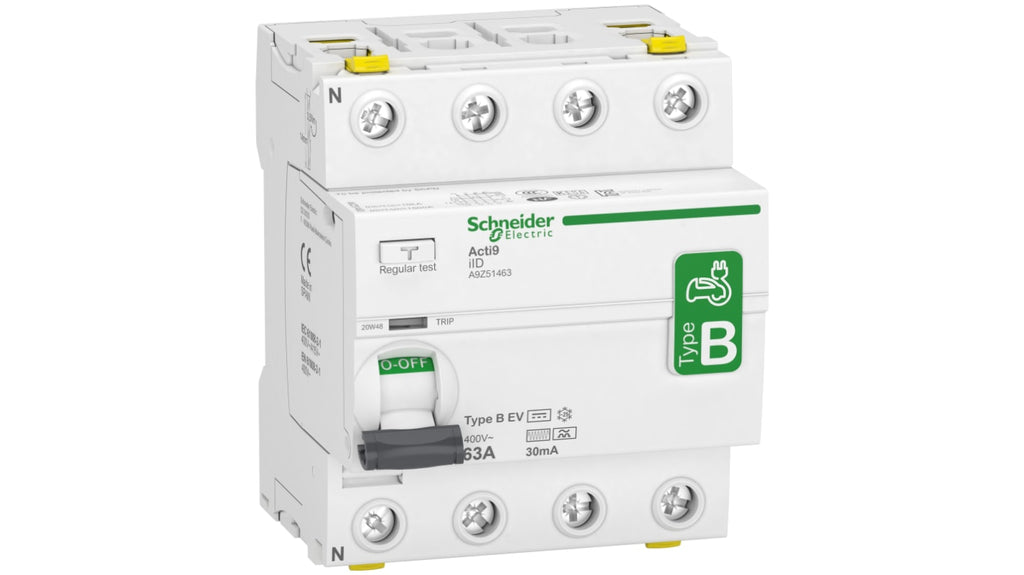 Interruttore differenziale RCCB Schneider Electric, 4 poli, corrente nominale 63 A, sensibilità di intervento 30 mA, tipo B-EV, tensione nominale 400 V ca, serie Acti 9. Grado di protezione IP20, IP40, temperatura operativa da -25 a 60 gradi, frequenza di rete 50/60 Hz. Azionamento manuale tramite interruttore a levetta. Codice costruttore A9Z51463.
