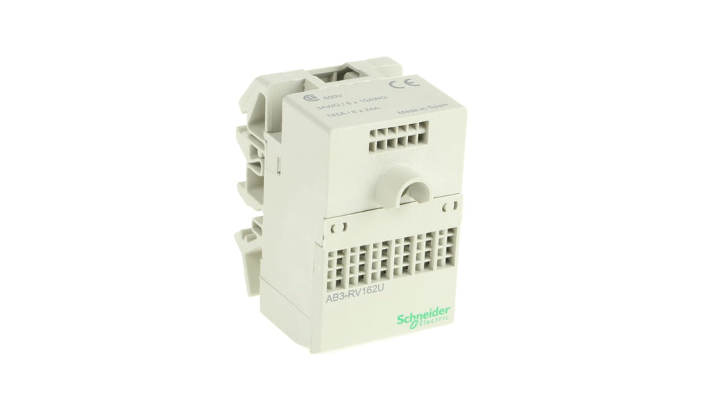Morsettiera ripartitrice unipolare per serie Ab3 e AK2. Montaggio su guida DIN simmetrica, distribuzione di 6 cavi fino a 2,5 mm2. Collegamento a monte tramite serraggio su barra di spessore 6 mm o su cavo flessibile/ridido. Morsetti a vite di tipo a gabbia con protezione completa per cavi a valle. Codice costruttore AB3RV162U, marchio Schneider Electric.