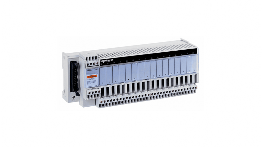 Modulo relè per guida DIN, 16 ingressi, tensione di alimentazione 19-30 V, progettato per prodotti Modicon ABE7, relè con terminali a vite, supporta cavi flessibili e solidi, indicatori LED di stato, distribuzione della polarità senza tensione, protezione dai cortocircuiti, grado di protezione IP2X, resistenza agli urti e alle vibrazioni. Codice costruttore ABE7P16T330, marchio Schneider Electric.