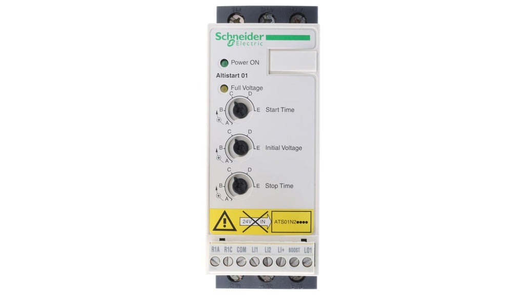 Avviatore soft-start per motori trifase, potenza nominale 1,1 kW, tensione 240 V c.a., corrente nominale 6 A, grado di protezione IP20. Modello Altistart 01, dimensioni 130,7 mm x 45 mm x 145 mm. Progettato per un avviamento morbido, compatibile con applicazioni industriali. Marchio Schneider Electric, codice costruttore ATS01N206LU.