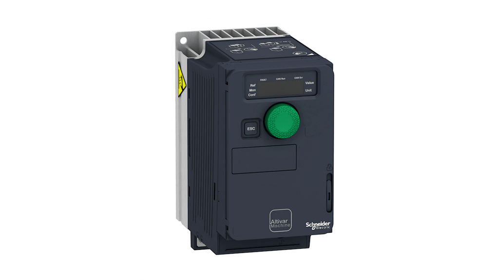 Avviatore a velocità variabile per motori in c.a., potenza nominale 0,18 kW, tensione di alimentazione 240 V, 3 fasi, corrente nominale 1,5 A, grado di protezione IP20, compatibile con comunicazione CANopen e Modbus seriale, dotato di funzione STO. Tolleranza tensione rete 10%, tolleranza frequenza rete 5%. Marca Schneider Electric, modello Altivar Machine ATV320.