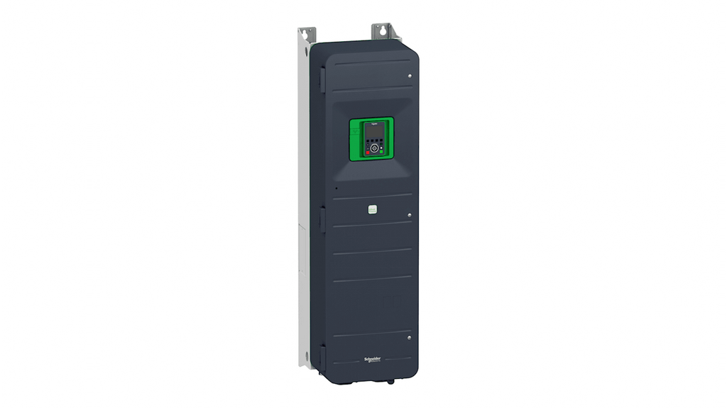 Avviatore a velocità variabile Schneider Electric, potenza nominale 90 kW, tensione 480 V, 3 fasi, corrente nominale 118,1 A a 156,2 A, frequenza di alimentazione 50-60 Hz, raffreddamento a convezione forzata, 16 velocità, 10 ingressi discreti, comunicazione Ethernet/IP e Modbus, grado di protezione IP55, linea prospettica ISC 50 kA, frequenza di commutazione 2,5 kHz, compatibile con motori in c.a.