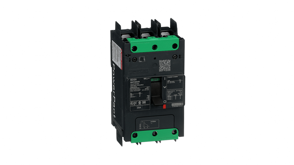 Interruttore magnetotermico Schneider Electric 3P 20A, Tipo D, corrente nominale 20 A, tecnologia magnetotermica, idoneità per isolamento conforme a IEC 60947-2, categoria di utilizzo A, durata meccanica 15000 cicli, durata elettrica 10000 cicli a 440 V, passo di collegamento 27 mm, montaggio guida DIN, serie BDF3, gamma PowerPact.