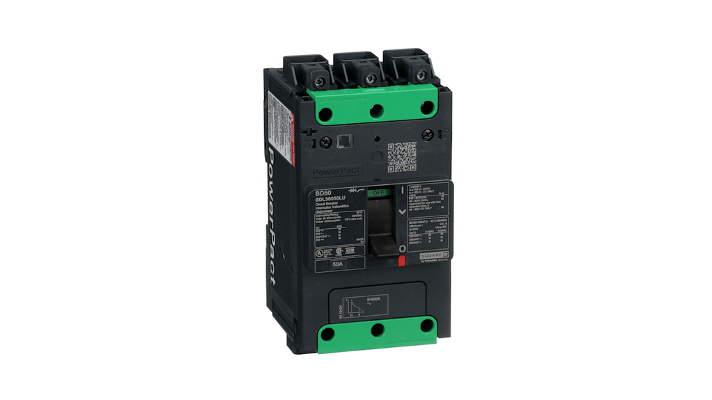 Interruttore automatico con contenitore stampato, 3 poli, 50A, tensione nominale 525 V c.a. 50/60 Hz, certificato UL 489, ingombro ridotto, lunghezza di spelatura cavo 20 mm, colore grigio RAL 7016, passi 9 mm, altezza 137 mm, gamma PowerPact, serie BDL3.