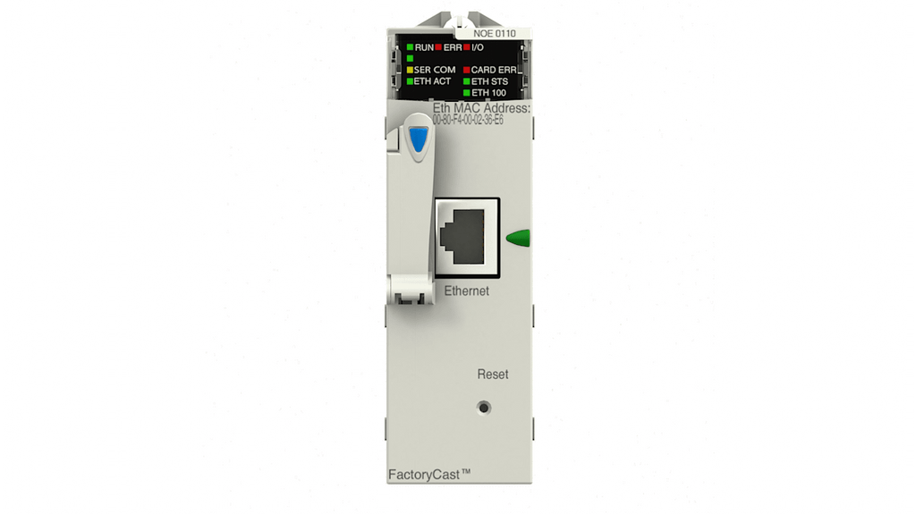 Modulo di comunicazione Ethernet per controller di automazione programmabili. Collegamento RJ45 10/100 Mbps, consumo di corrente 90 mA a 24 V c.c., grado di protezione IP20, temperatura operativa da 0 a 60 gradi Celsius. Compatibile con la serie Modicon M340, modello BMX.