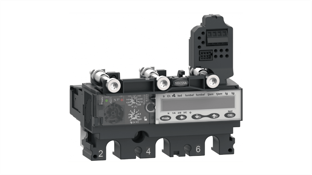Unità di scatto Schneider Electric per interruttori automatici ComPacT NSX 100/160/250, protezione regolabile a lungo termine contro sovraccarichi, protezione regolabile e istantanea contro cortocircuiti, pre-allarme di dispersione di terra con modulo SDx opzionale, LED verde per stato di attivazione, modulo display per misurazione energia e regolazioni. Accessori inclusi, compatibile con gamma ComPacT di nuova generazione.
