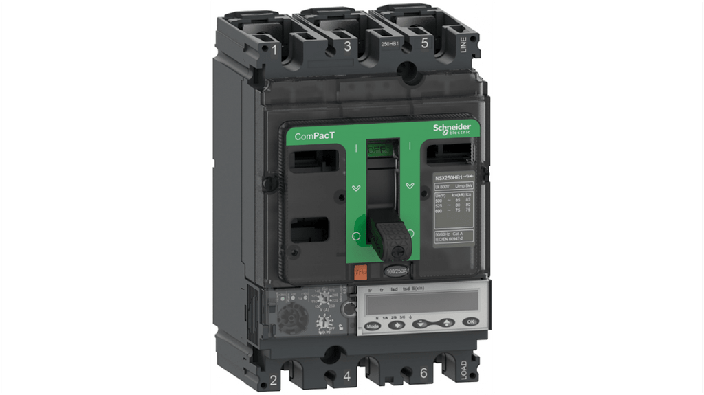 Interruttore magnetotermico scatolato, 3 poli, 100A, montaggio fisso, progettato per ottimizzare spazio e capacità di interruzione, protezioni regolabili a lungo e breve termine, protezione istantanea fissa, unità di attivazione MicroLogic 6.2E, conforme a standard internazionali IEC 60947, CCC, EAC.