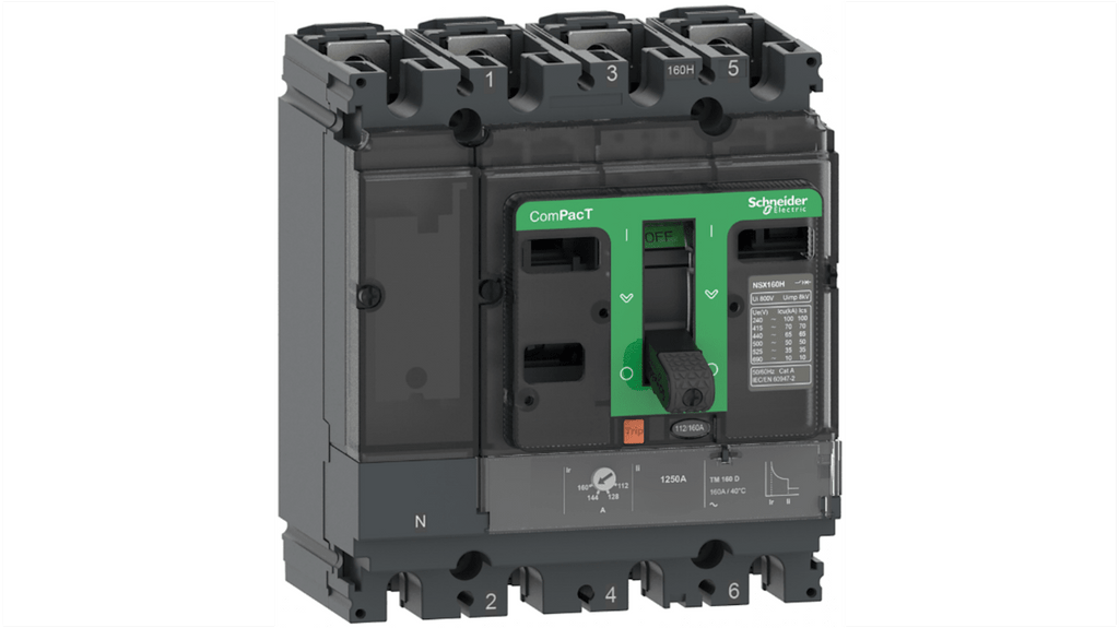 Interruttore automatico fisso, 4 poli, 100A, progettato per ottimizzare spazio e capacità di interruzione. Protezione da sovraccarico termico regolabile e magnetica fissa. Installazione semplificata, riduzione del 40% dei tempi di cablaggio. Ergonomica paletta per funzionamento manuale facilitato. Marchio: Schneider Electric, modello: C16H4TM100, serie: NSX160H, gamma: ComPacT di nuova generazione.
