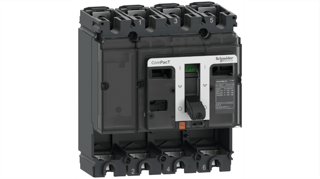 Interruttore magnetotermico scatolato, 4 poli, 250A, montaggio fisso, telaio di base progettato per ottimizzare spazio e capacità di interruzione, compatibile con unità di attivazione di vari tipi, design ergonomico per installazione facilitata, paletta ergonomica per funzionamento manuale semplificato. Marchio: Schneider Electric, codice costruttore: C25S4D.