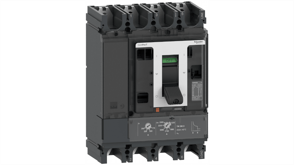 Interruttore magnetotermico scatolato, 4 poli, 320A, montaggio fisso, progettato per ottimizzare spazio e capacità di interruzione, protezione regolabile a lungo termine, breve termine e istantanea, nuova paletta ergonomica per funzionamento manuale facilitato, riduzione del 40% dei tempi di cablaggio, installazione semplificata grazie al design ergonomico della piastra frontale. Marchio: Schneider Electric, codice costruttore: C40F4TM320D1.
