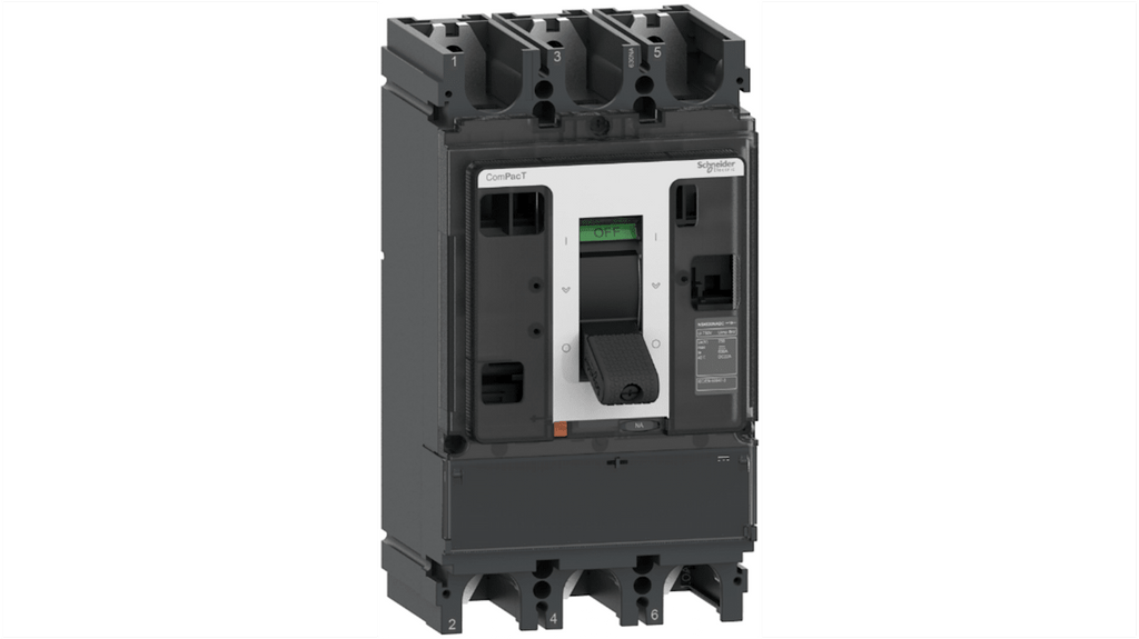 Sezionatore completo a 3 poli Schneider Electric, corrente nominale fusibile 630A, integrato, ComPacT di nuova generazione, serie NSX630NA, installazione semplificata, riduzione del 40% dei tempi di cablaggio, nuova paletta ergonomica per funzionamento manuale facilitato.